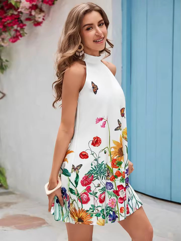 Dieses Damenkleid vereint romantische Leichtigkeit mit modernem Boho-Stil. Der liebevoll gestaltete Blumen- und Schmetterlingsprint verleiht dem Kleid eine feminine, verspielte Ausstrahlung und macht es zu einem echten Blickfang.