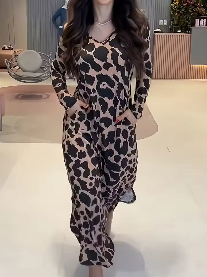 Dieses lässige Damen-Tunika-Kleid in großen Größen überzeugt mit einem modischen Leopardenprint und einem schmeichelhaften V-Ausschnitt, der die Silhouette optisch streckt. Der lockere Schnitt sorgt für hohen Tragekomfort und eine entspannte Passform.