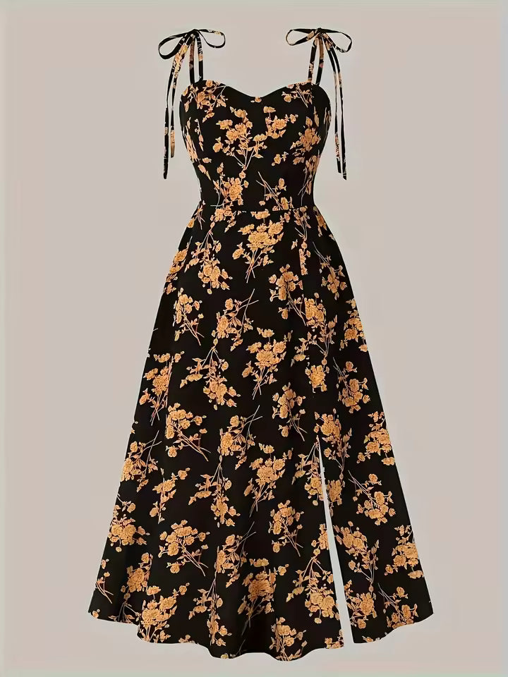 Le nœud à la taille affine la silhouette tandis que la fente élégante ajoute une note sensuelle sans compromis sur le confort.